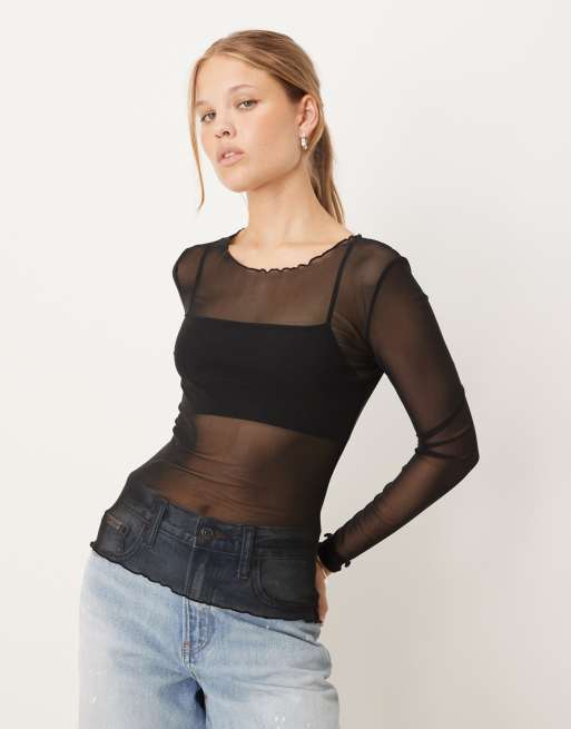 Top negro de manga larga de malla de JDY