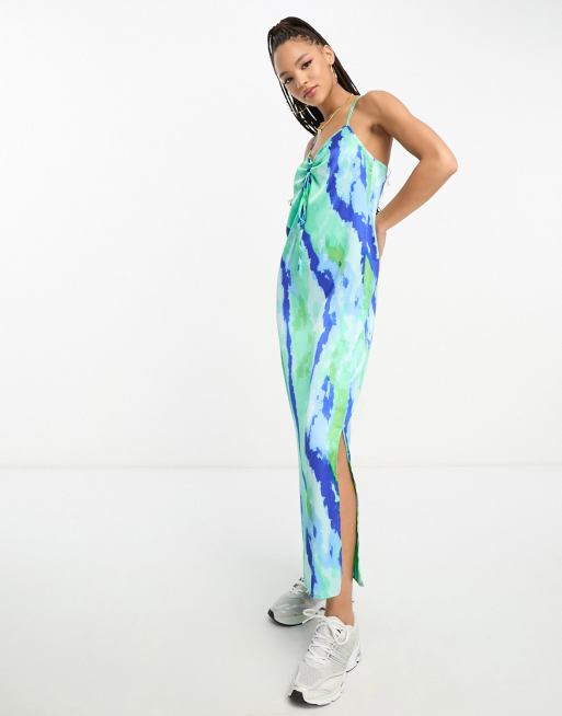 Vestido midi azul y verde efecto acuarela fruncido de satén exclusivo de JDY