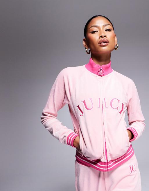 Sudadera rosa pastel con cuello alto, cremallera y diseño universitario de velour de Juicy Couture
