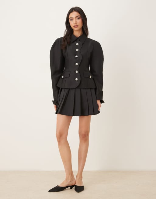 Conjunto negro de minifalda y americana con mangas voluminosas y tapeta festoneada de JW PEI