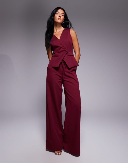 Conjunto de sastre burdeos de pantalones de pernera ancha y chaleco con botones delanteros de Kaiia