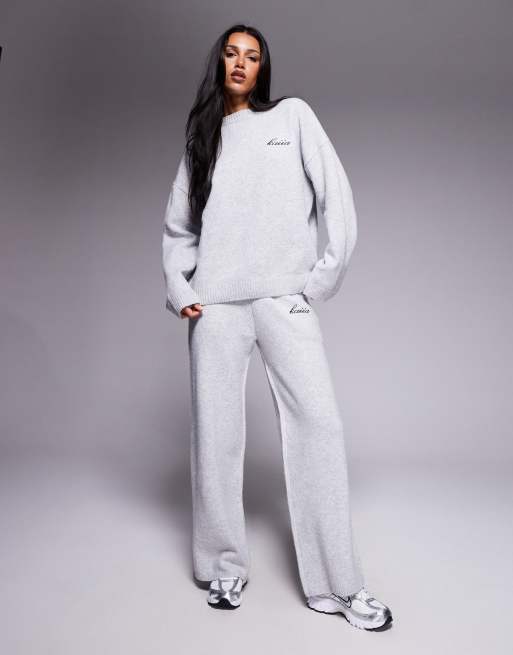 Conjunto gris claro de pantalones de pernera ancha y jersey con cuello redondo, sisas caídas y logo bordado de punto de Kaiia