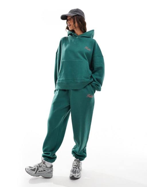 Conjunto verde oscuro de sudadera extragrande con capucha y joggers con bajos elásticos y logo rosa de Kaiia