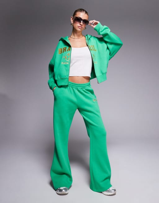Conjunto verde y amarillo de joggers, sudadera con capucha y camiseta entallada con diseño encogido y estampado "Brazil" de Kaiia Sport