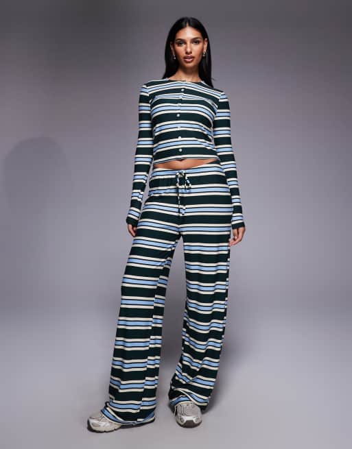 Conjunto verde y azul pastel a rayas de pantalones, top extragrande de manga larga y top de manga larga con botones exclusivo de Kaiia