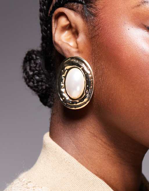 Pendientes dorados con diseño ovalado extragrande repujado y detalle de perla de Kaiia