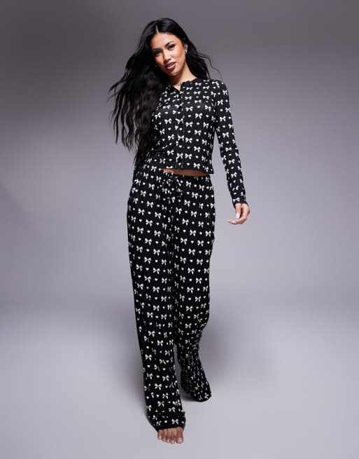 Pijama negro y blanco con estampado de lazos de camisa corta abotonada y pantalones exclusivo de Kaiia