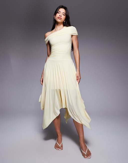 Vestido largo amarillo limón ceñido con cintura baja, bajo de picos y detalle drapeado asimétrico de tejido doble exclusivo de Kaiia