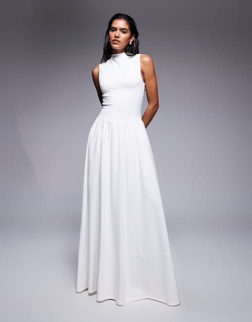 Vestido largo color crema sin mangas con cuello alto y falda fruncida exclusivo de Kaiia