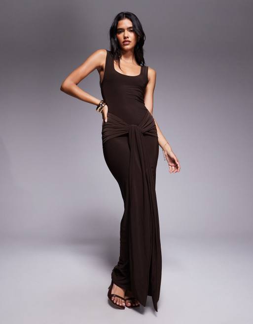 Vestido largo marrón chocolate ceñido con cuello ancho, lazada delantera y detalle drapeado de tejido doble exclusivo de Kaiia