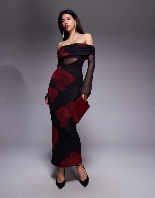 Vestido largo negro con estampado floral rojo, mangas ángel, escote Bardot y detalle de paneles transparentes de malla exclusivo de Kaiia