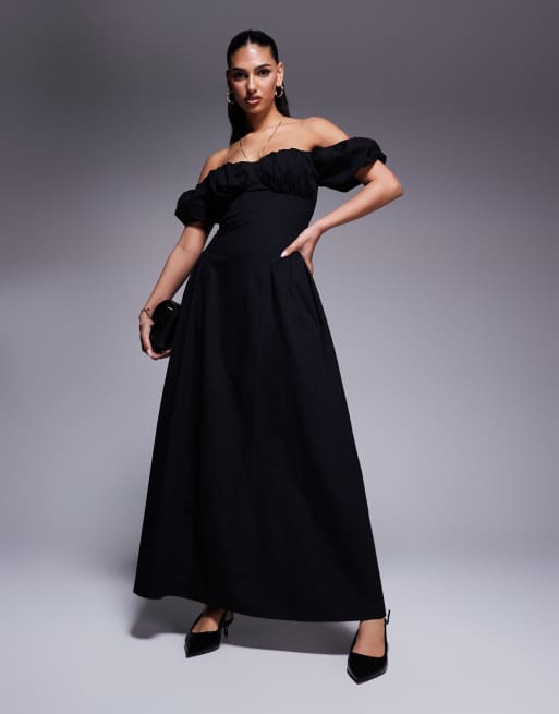 Vestido largo negro de estilo mesonera con mangas abullonadas y detalle de pliegues en la cintura de algodón exclusivo de Kaiia