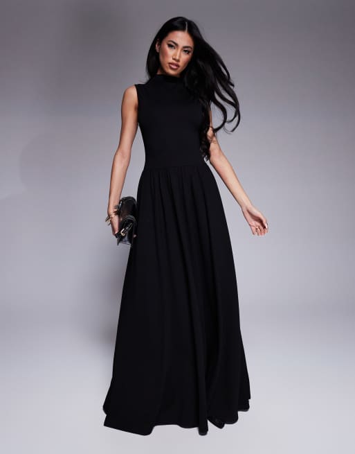 Vestido largo negro sin mangas con cuello alto y falda fruncida exclusivo de Kaiia