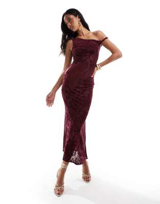 Vestido largo rojo estampado con hombro caído de devoré exclusivo de Kaiia