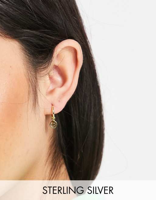 Pendientes de aro pequeños con charm de cara sonriente de plata de ley chapada en oro de Kingsley Ryan