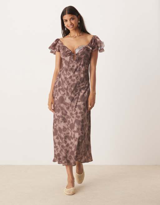Vestido semilargo marrón expreso con mangas fluidas y volantes de Kiss The Sky