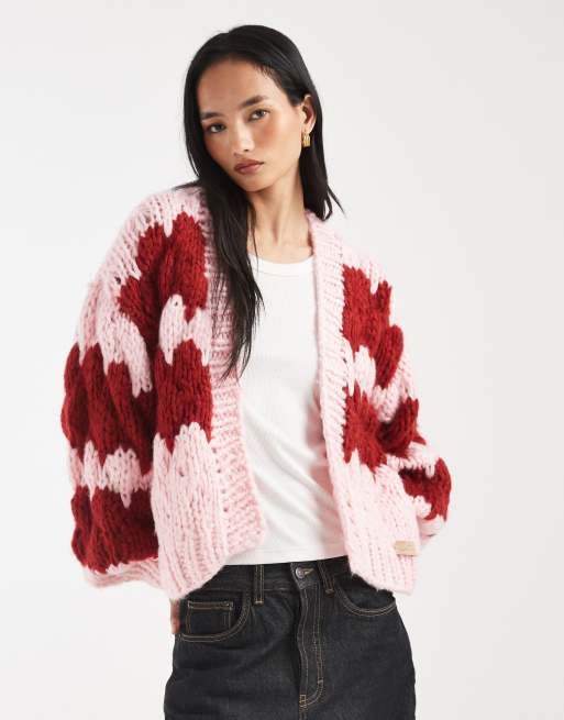 Cárdigan rojo y rosa de punto burbuja tejido a mano Hugs & Kisses de Kiwi & Co