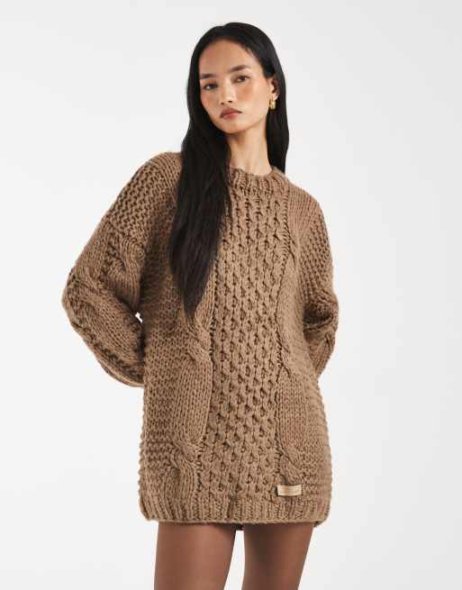 Vestido corto marrón moca estilo jersey con mangas globo de punto de ochos cosido a mano Orlo de Kiwi & Co