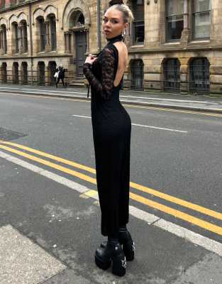 Vestido negro largo de corte recto con lazo de encaje de Labelrail x Daisy Birchall