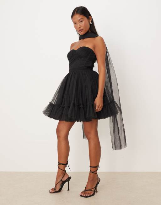 Vestido corto negro con diseño estilo corsé y fular de tul de Lace & Beads Petite