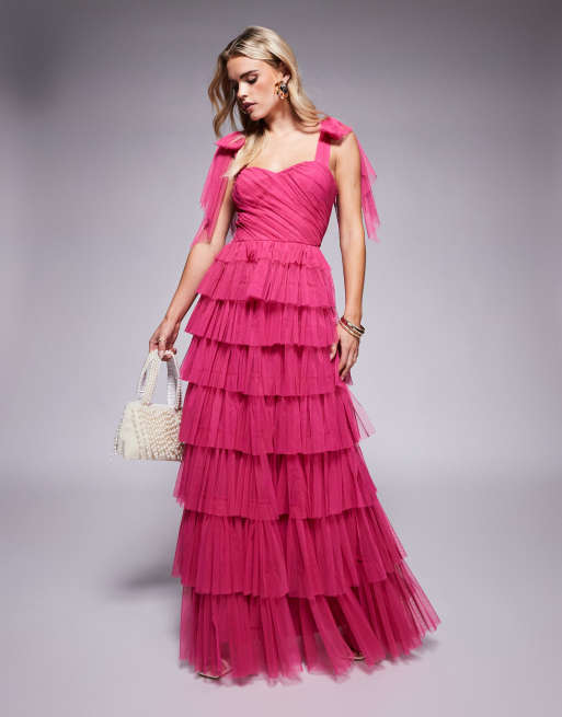 Vestido largo rosa escalonado con tirantes en los hombros de tul de Lace & Beads Petite