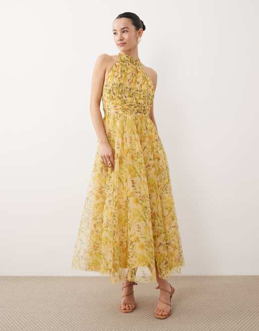 Vestido midi amarillo con estampado floral y cuello alto de tul de Lace & Beads Petite