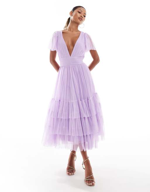 Vestido de dama de honor midi lila lavanda con cuello de pico de tul Madison de Lace & Beads