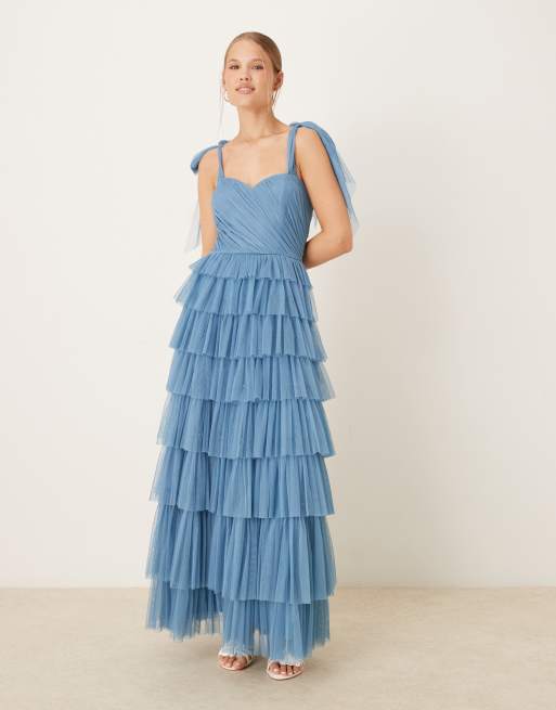 Vestido largo azul escalonado con lazos en los hombros de tul de Lace & Beads