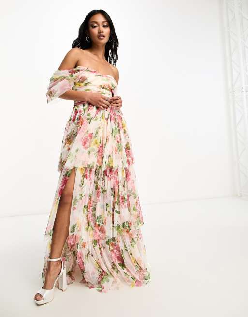 Vestido largo en tonos luminosos asimétrico con estampado floral y escote Bardot exclusivo de Lace & Beads