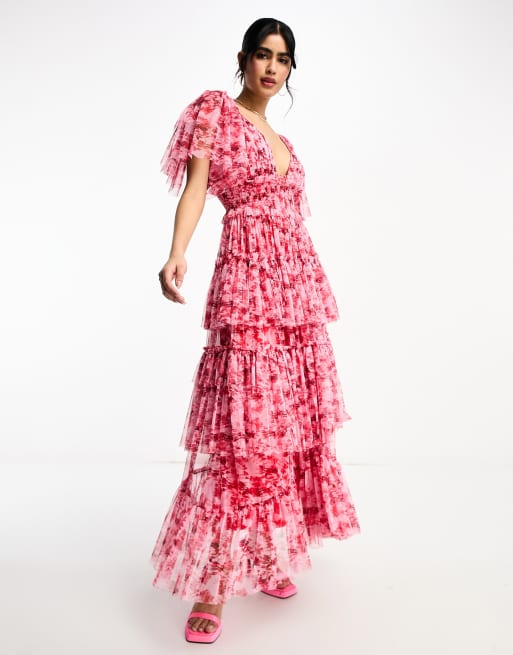 Vestido largo rojo con estampado floral, mangas fluidas y volantes exclusivo de Lace & Beads