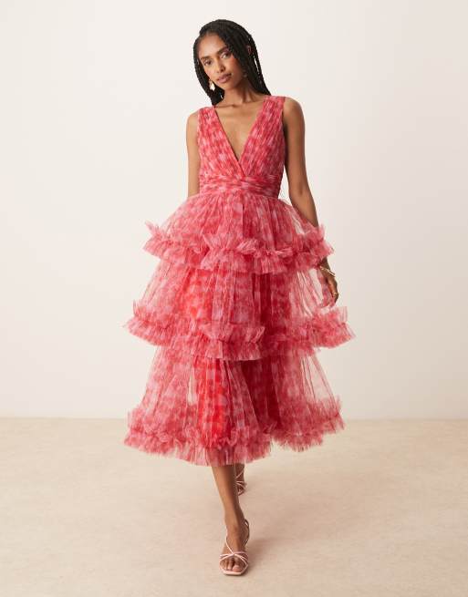 Vestido semilargo rojo y rosa escalonado con estampado floral y volantes de Lace & Beads