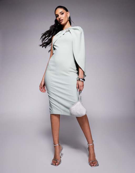 Vestido midi verde salvia asimétrico con capa y detalle de lazo de pedrería de Lavish Alice