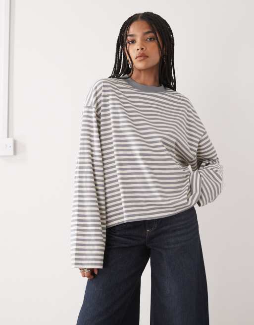 Camiseta gris ceniza a rayas de manga larga y corte cuadrado con cuello redondo de mezcla de algodón Bloom de Lioness