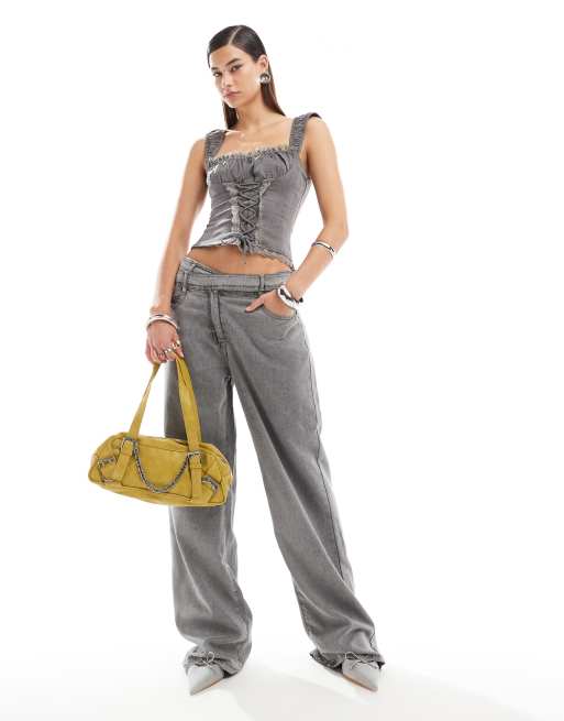 Conjunto vaquero gris lavado de top corsetero con cordones y ribete de encaje y pantalones vaqueros de Lioness