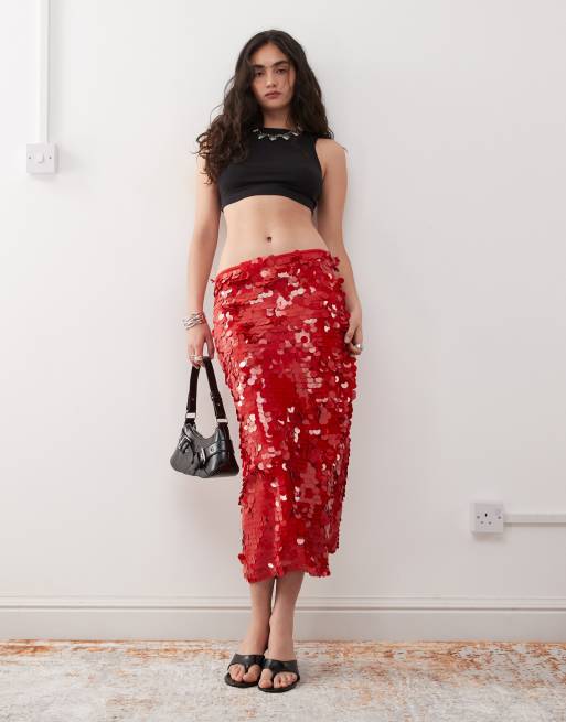 Falda semilarga roja de talle bajo con lentejuelas grandes de Lioness