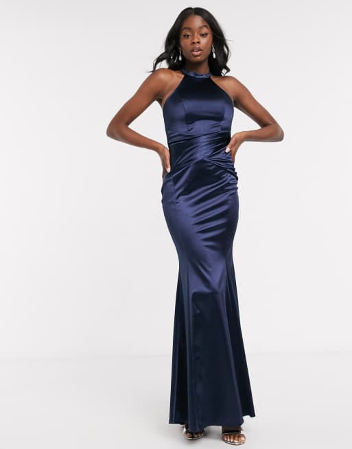 Vestido largo ceñido con cuello subido y nudo delantero en azul noche de Lipsy x Abbey Clancy