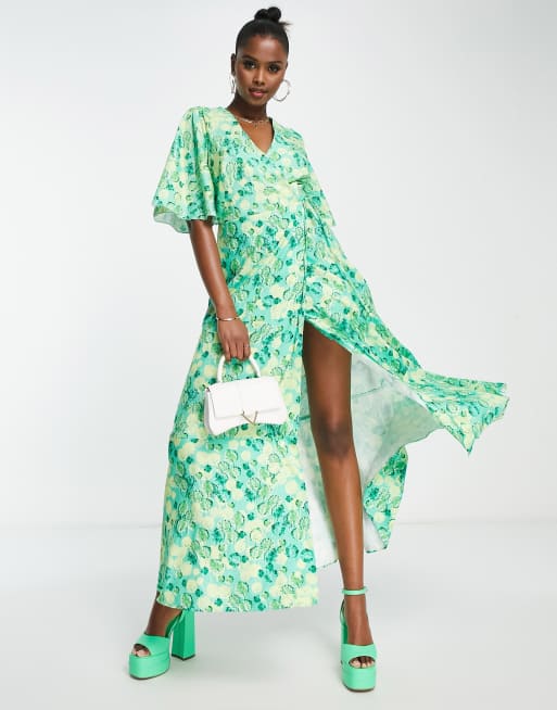 Vestido largo verde cruzado con estampado floral y mangas kimono de Liquorish