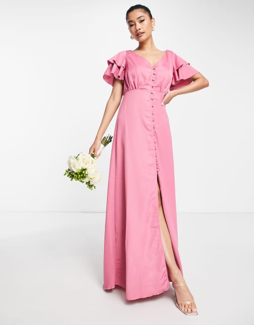 Vestido de dama de honor largo rosa oscuro con mangas con vuelo de satén de Little Mistress