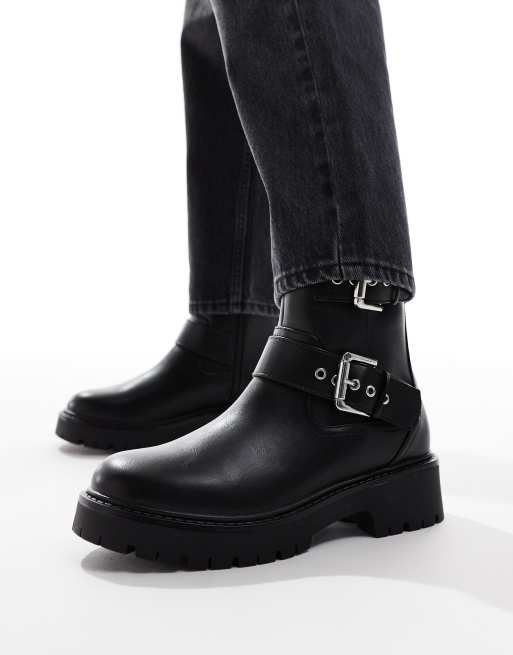 Botines biker negros con hebilla Keely de London Rebel Wide Fit