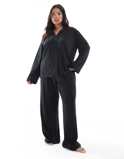 Pijama negro de pantalones de pernera ancha y top con cuello de solapas y detalle de ribetes de tejido muy suave de Loungeable Curve