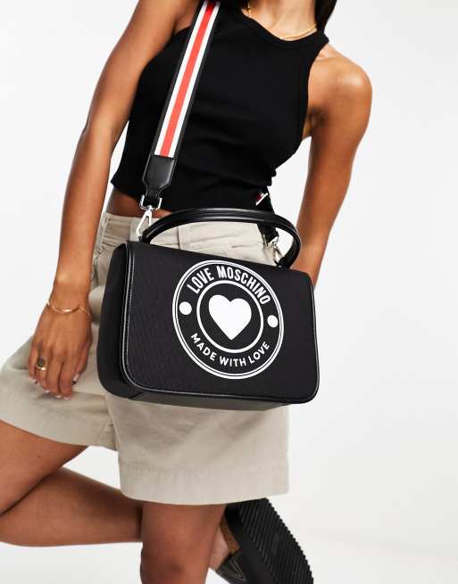 Bandolera negra con logo circular y asa superior de lona de Love Moschino