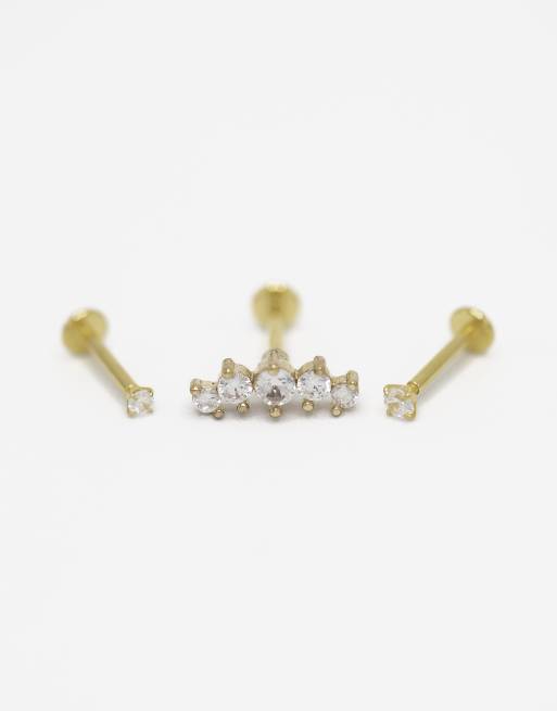 Pack de 3 piercings dorado de acero quirúrgico chapado en oro con parte trasera plana y diseños redondos y trepador de Lovisa