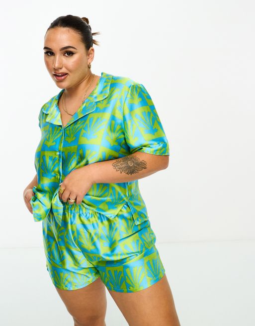 Pijama de pantalones cortos y camisa con estampado de conchas retro y cuello de solapas de satén de Luna Plus