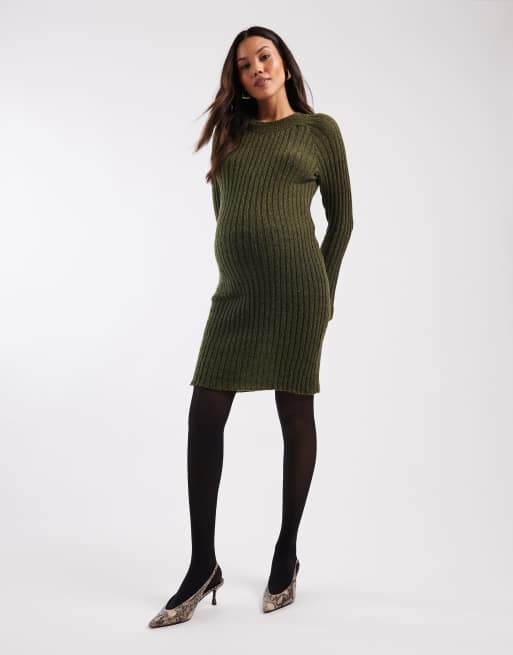 Vestido corto caqui jaspeado con mangas acampanadas de punto de canalé suave de Mamalicious Maternity