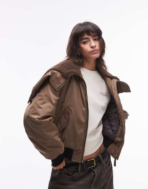 Abrigo acolchado corto caqui con detalle de borreguito de Mango