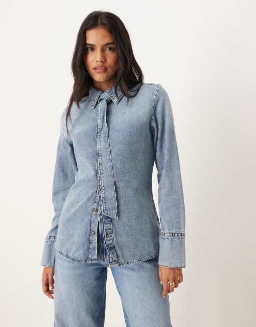 Camisa vaquera azul medio de manga larga con lazada al cuello de mezcla de algodón de Mango