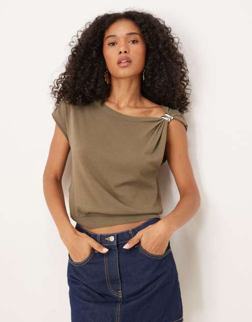 Camiseta marrón asimétrico con detalle fruncido de Mango