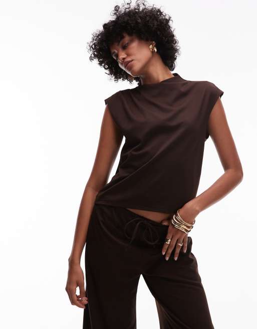 Camiseta marrón chocolate con cuello barco y mangas de casquillo de poliamida de Mango (parte de un conjunto)