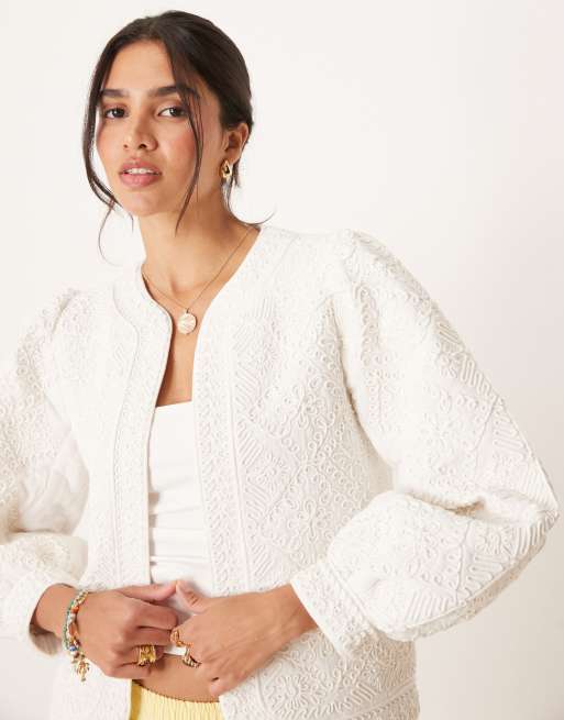 Chaqueta blanca sin solapas con mangas abullonadas y bordados de algodón de Mango