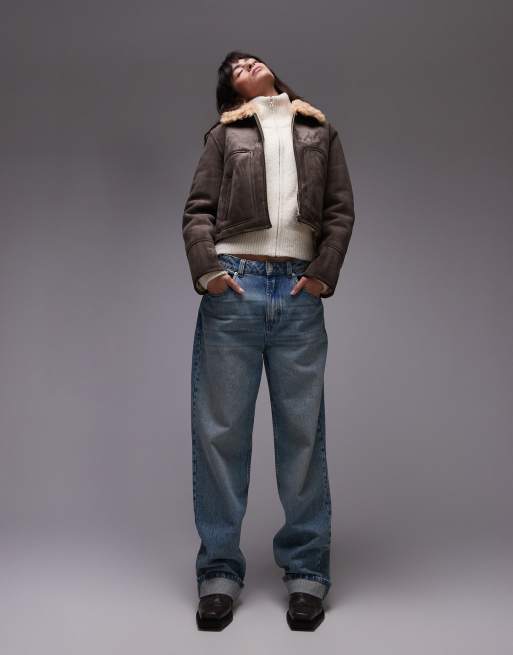 Chaqueta de aviador corta marrón de tejido efecto ante con solapas de borreguito de Mango